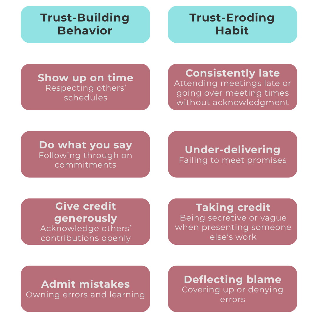 Model It: Consistently model the trust-building behaviors you want to see - especially admitting mistakes and owning errors.
